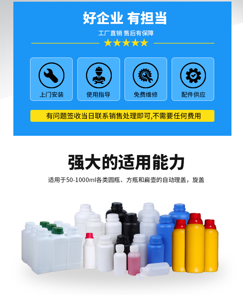 1、通用性強:適用于50-1000ml各類圓瓶、方瓶和扁壺的自動理蓋,旋蓋;