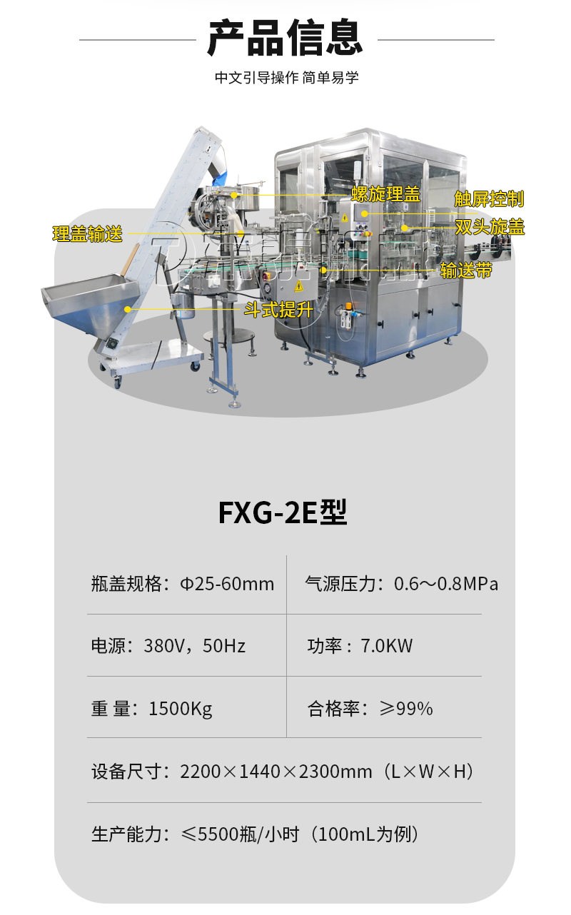 FXG-2E型全自動雙頭跟隨式旋蓋機由理蓋輸蓋機構、抓蓋旋蓋機構、運動模塊、輸送機構及控制系統組成。整機結構簡單、調整方便。該設備為我司新研制,產品在移動過程中,完成旋蓋動作。區別于常規旋蓋機,在旋蓋時需要停頓,會使物料晃出瓶口,污染瓶身。該機旋蓋不停頓,有效的避免了旋蓋停頓晃液,保持瓶身清潔。