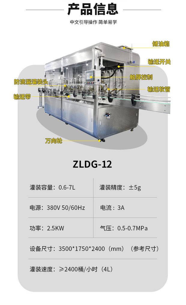 2.灌裝采用電機(jī)升降結(jié)構(gòu),不同規(guī)格灌裝時(shí)直接在觸摸屏上調(diào)整灌裝頭高度,一鍵完成,無