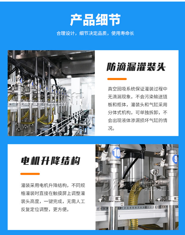 過程中無滴漏現(xiàn)象,不會(huì)污染輸送鏈板和瓶體,灌裝頭和氣缸采用分體式機(jī)構(gòu),可單獨(dú)拆卸,